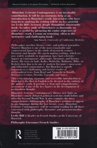Blanchot provides a compelling insight into one of the key figures in the development of postmodern thought. Although Blanchot's work is characterised by a fragmentary and complex style, Leslie Hill introduces clearly and accessibly the key themes in his work. He shows how Blanchot questions the very existence of philosophy and literature and how we may distinguish between them, stresses the importance of his political writings and the relationship between writing and history that characterised Blanchot's later work; and considers the relationship between Blanchot and key figures such as Emmanuel Levinas and Georges Bataille and how this impacted on his work. Placing Blanchot at the centre stage of writing in the twentieth century, Blanchot also sheds new light on Blanchot's political activities before and after the Second World War. This accessible introduction to Blanchot's thought also includes one of the most comprehensive bibliographies of his writings of the last twenty years.