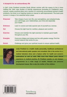 Self, Linda Friedland provides South African women with the means to live a more fulfilling life. With case studies of real-life experiences (including Dr Friedland's own), quizzes, weekly practical plans and a section on commonly encountered women's health problems, the book is an inspiring hands-on manual to self-improvement. The book puts women in charge of six essential action areas: