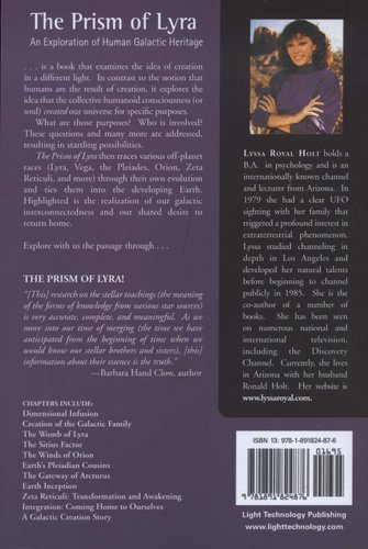 The Prism of Lyra then traces various off-planet races (Lyra, Vega, the Pleiades, Orion, Zeta Reticuli, and more) through their own evolution and ties them into the developing Earth. Highlighted is the realization of our galactic interconnectedness and our shared desire to return home.