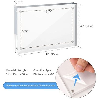 Our 2 pack magnetic acrylic frame is a must have frame set for modern homes. It is made of class A casting acrylic panel, super clear and high purity material, over 95% light transmission rate. All the acrylic frames are UV-resistant which can protect the picture from fading under sun light or fluorescent light. and break-resistant which is more sturdy and safer than other poor fragile glass.