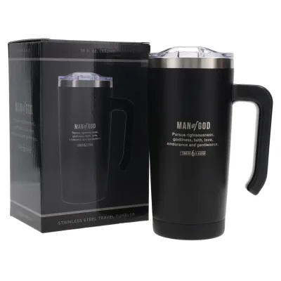 The Man of God Black Stainless Steel Travel Mug with Handle is a bold,