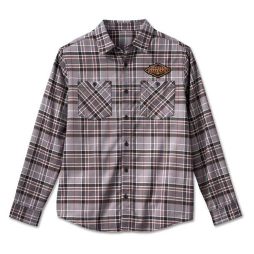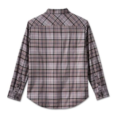 Plaid from an enduring blend of cotton/polyester/spandex twill that’s washed for