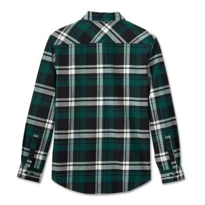 Level up your plaid look for all the season’s festivities in our Bar & Shield Flannel made for true comfort from rugged cotton twill that’s brushed for softness. This men’s long sleeve button down features chest pockets for stashing essentials plus a hidden snap-down collar that stays put under riding gear. Its stylish pattern is the perfect backdrop for the jersey appliqué of our most beloved logo on front. Snag yours before they disappear. • Materials: 100% cotton midweight brushed twill. • Closure: Button front, sleeves, and cuffs. • Pockets: Button flap chest pockets. • Design Details: Hidden snap-down collar. • Graphics: Jersey appliqué with zigzag stitching.