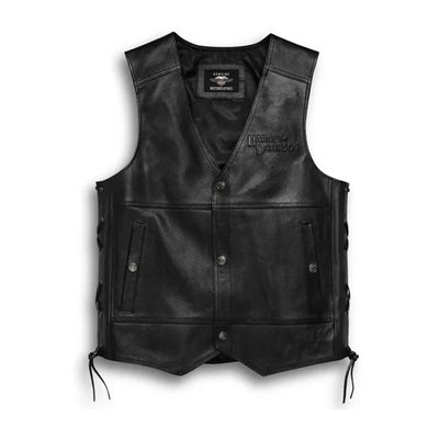 The classically styled Tradition II Leather Vest keeps it simple so you can make it your own with patches, pins, and more. Cut from hard-wearing cowhide, this men's leather vest includes adjustable lacing for a custom fit. • Fit & Mobility: Adjustable side lacing. • Ride Enhancing Features: Snap front. • Pockets: Snap hand-warmer pockets. • Design Details: Embossed graphics. • Materials: Midweight cowhide leather. Polyester twill lining.