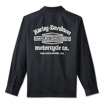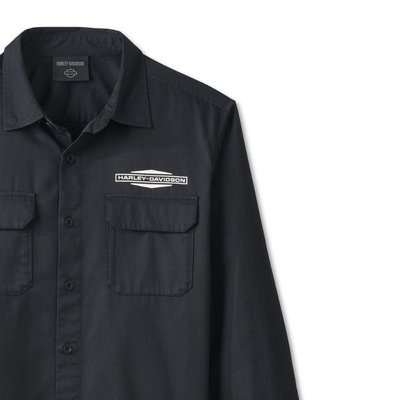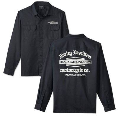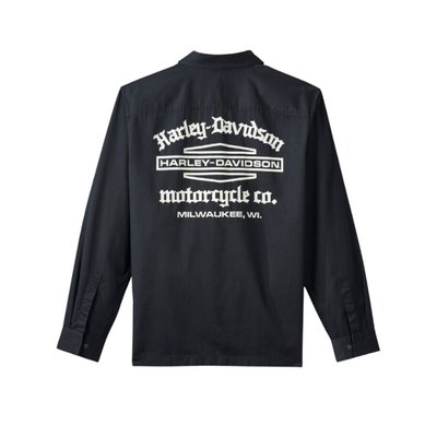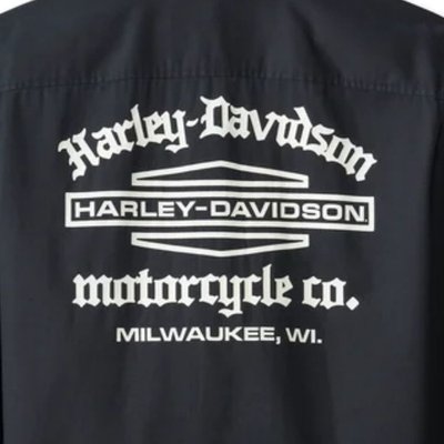 Harley-Davidson. Know the history—the stacked Bar & Shield logo featured on this