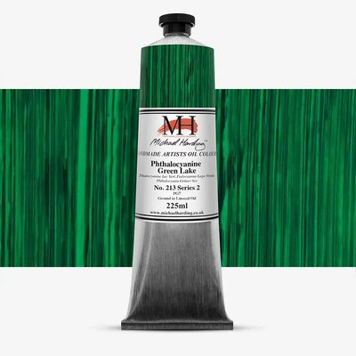Polychloro Copper Phthalocyanine probably ties with Phthalo Blue as the strongest pigment in the range. Atomic tint power, add it with great care! Ferocious acidy blue-green hues and blue undertones which come to prominence in mixes with yellows. In common with the Blue it displays, on drying and when used virtually unmixed, a certain tendency to show surface bronzing.