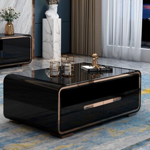Odora Coffee Table will be a seamless addition to living room. with its gloss black finish and versatile storage options, adding the rose gold color stainless steel outline, this is sure to make your home entertainment system sparkle.