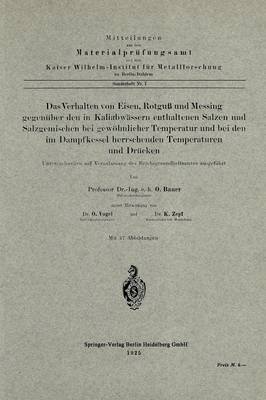Das Verhalten von Eisen, Rotguss und Messing gegenuber den in Kaliabwassern enthaltenen Salzen und Salzgemischen bei gewoehnlicher Temperatur und bei den im Dampfkessel herrschenden Temperaturen und Drucken - Untersuchungen auf Veranlassung des Reichsgesundheitsamtes ausgefuhrt (German, Paperback, 1925 ed.)