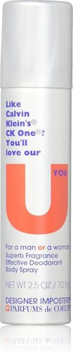 Incorporating the same bergamot, lemon, mandarin, jasmine and lily of the valley scent notes that made Calvin Klein's Ck One a hit, Designer Imposters U You elevates your self-confidence every time you splash a bit of the scent on your neck and wrists. Wear this fresh, clean scent from Parfums de Coeur to your next meeting to exude self-assurance, or use it before you meet with a big client to inject swagger into your step.