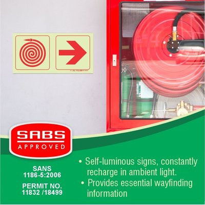 Ensure clear visibility and compliance in emergency situations with the Photoluminescent Safety Sign — Fire Hose Reel Arrow Right (SNP19F20). Measuring 190mm, this high-quality safety sign is designed to glow in the dark, making it easy to locate essential fire safety equipment even during power outages. Durable and easy to mount, it's suitable for workplaces, public buildings, and industrial environments.