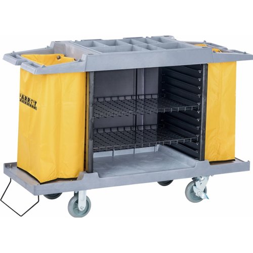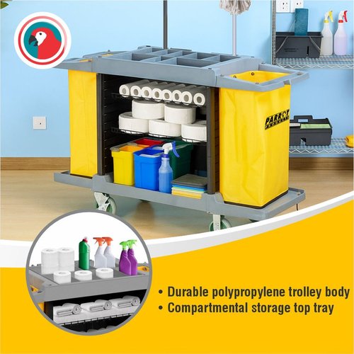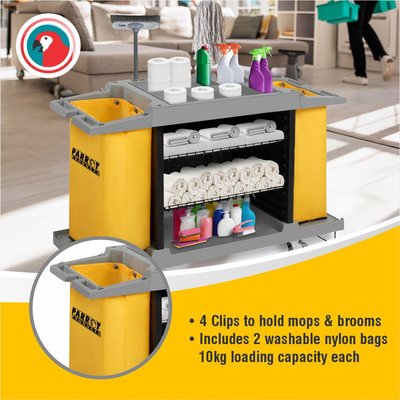 The Parrot JA0707 Housekeeping Trolley is a high-capacity, durable cleaning cart designed for hospitality, commercial, and institutional use. Built from quality polypropylene, it features organized storage, durable construction, and smooth mobility—making it a smart solution for efficient janitorial operations.