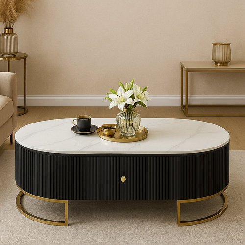 The Philippa Coffee Table is a statement piece that brings sophistication and elegance to any living space. Featuring a sleek oval design, it boasts a luxurious white marble-effect top with subtle veining that contrasts beautifully with the textured black base. The gold metal accents and curved open-frame legs add a touch of modern glamour, while the discreet central drawer offers practical storage for everyday essentials.