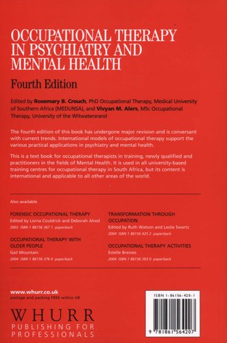 The fourth edition of this book is directed at a broader, international, undergraduate and professional occupational therapy readership and has undergone major revision and up-dating. In this edition international models of occupational therapy, including a South African model, support the various practical applications of occupational therapy in the various areas of occupational therapy in psychiatry and mental health.