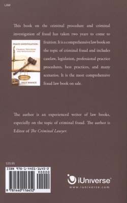 This book on the criminal procedure and criminal investigation of fraud has taken two years to come to fruition. It is a comprehensive law book on the topic of criminal fraud and includes caselaw, legislation, professional practice procedures, best practices, and many scenarios. It is the most comprehensive fraud law book on sale.