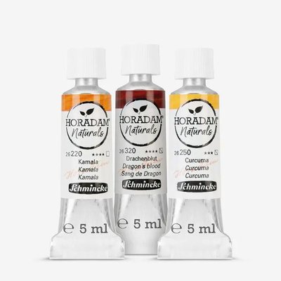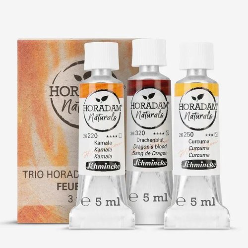 The Schmincke Horadam Naturals 5ml Fire Trio Set is a perfect way to explore these unique paints that combine the characteristics of watercolour and gouache. This selection is part of a collection of sets that contain three thematically related, naturally derived, watersoluble colours.