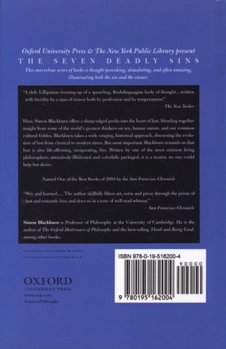 Lust, says Simon Blackburn, is furtive, headlong, always sizing up opportunities. It is a trail of clothing in the hallway, the trashy cousin of love. But be that as it may, the aim of this delightful book is to rescue lust "from the denunciations of old men of the deserts, to deliver it from the pallid and envious confessor and the stocks and pillories of the Puritans, to drag it from the category of sin to that of virtue." Blackburn, author of such popular philosophy books as Think and Being Good, here offers a sharp-edged probe into the heart of lust, blending together insight from some of the world's greatest thinkers on sex, human nature, and our common cultural foibles. Blackburn takes a wide ranging, historical approach, discussing lust as viewed by Aristophanes and Plato, lust in the light of the Stoic mistrust of emotion, and the Christian fear of the flesh that catapulted lust to the level of deadly sin. He describes how philosophical pessimists like Schopenhauer and Sartre contributed to our thinking about lust and explores the false starts in understanding lust represented by Freud, Kinsey, and modern "evolutionary psychology." But most important, Blackburn reminds us that lust is also life-affirming, invigorating, fun. He points to the work of David Hume (Blackburn's favorite philosopher) who saw lust not only as a sensual delight but also "a joy of the mind." Written by one of the most eminent living philosophers, attractively illustrated and colorfully packaged, Lust is a book that anyone would lust over.