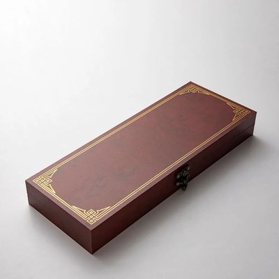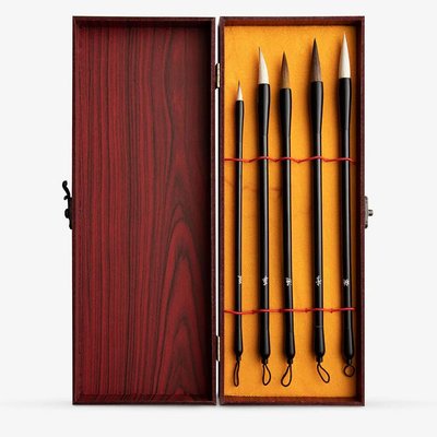 A set of five brushes for Chinese brush painting. In a 32x12cm coated wooden presentation box with a nice clasp, inside a fabric covered outer gift box.