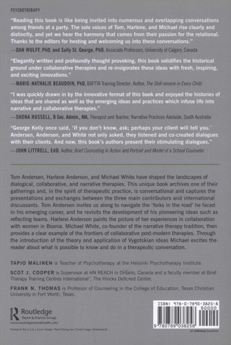 Tom Andersen, Harlene Anderson, and Michael White have shaped the landscapes of dialogical, collaborative, and narrative therapies. This unique book archives one of their gatherings and, in the spirit of therapeutic practice, is conversational and captures the presentations and exchanges between the three main contributors and international discussants. Tom Andersen invites us along to navigate the forks in the road he faced in his emerging career, and he revisits the development of his pioneering ideas such as reflecting teams. Harlene Anderson paints the picture of her experiences in collaboration with women in Bosnia. Michael White, co-founder of the narrative therapy tradition, then provides a clear example of the frontiers of collaborative post-modern therapies. Through the introduction of the theory and application of Vygotskian ideas Michael excites the reader about what is possible to know and do in a therapeutic conversation.