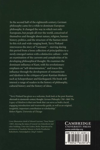 In the second half of the eighteenth century, German philosophy dominated European philosophy, changing the way Europeans and people all over the world conceived of themselves and thought about nature, religion, human history, politics, and the structure of the human mind. In this rich and wide-ranging book, Terry Pinkard interweaves the story of "Germany"--changing during this period from a loose collection of principalities into a newly-emerged nation with a distinctive culture--with an examination of the currents and complexities of its developing philosophical thought. He examines the dominant influence of Kant, with his revolutionary emphasis on "self-determination," and traces this influence through the development of romanticism and idealism to the critiques of post-Kantian thinkers such as Schopenhauer and Kierkegaard. His book will interest a range of readers in the history of philosophy, cultural history and the history of ideas. Terry Pinkard is professor of Philosophy at Northwestern University and is the author of the acclaimed Hegel: A Biography (Cambridge, 2000). He is honorary Professor of the Philosophy Faculty of TÜbingen University, Germany and serves on the advisory board for the Zeitschrift fÜr Philosophique Forschung.