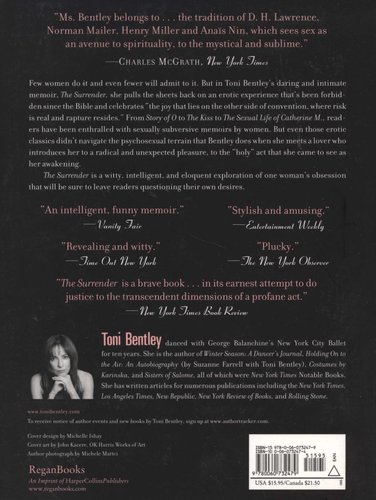 Few women do it and even fewer will admit to it. But in Toni Bentley's daring and intimate memoir, The Surrender, she pulls the sheets back on an erotic experience that's been forbidden since the Bible and celebrates "the joy that lies on the other side of convention, where risk is real and rapture resides." From Story of O to The Kiss to The Sexual Life of Catherine M., readers have been enthralled with sexually subversive memoirs by women. But even those erotic classics didn't navigate the psychosexual terrain that Bentley does when she meets a lover who introduces her to a radical and unexpected pleasure, to the "holy" act that she came to see as her awakening.