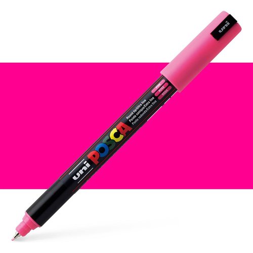 Uni Posca water-based pigment markers produce opaque, vibrant colour and will on write on virtually any surface: paper, cardboard, tracing paper, rock, clay, cement, plastic, metal, wood, fabric, glass, canvas and more. These markers are odourless, alcohol- and solvent-free, and suitable for indoor or outdoor use. Posca paint is opaque and fluid. It gives easy coverage and yet is bleed-resistant when used on paper. Once dry, the paint is waterproof; it is possible to draw on top of previous layers to build up designs or correct errors. Light colours are just as opaque as the dark colours, and can be used to add overlaid highlights. The sharpest marker in the Posca range, the PC-1MR has an ultra-fine pin tip which can be used for fine detail in any artistic situation.