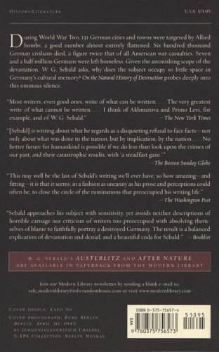 During World War Two, 131 German cities and towns were targeted by Allied bombs, a good number almost entirely flattened. Six hundred thousand German civilians died--a figure twice that of all American war casualties. Seven and a half million Germans were left homeless. Given the astonishing scope of the devastation, W. G. Sebald asks, why does the subject occupy so little space in Germany's cultural memory? On the Natural History of Destruction probes deeply into this ominous silence.