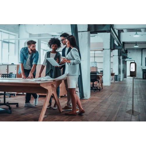 This portable disinfectant stand is particularly suitable for highly frequented areas such as restaurants, offices, hotels, shops & co. as a free-standing infection protection unit. If required, the base plate has 4 holes and can be additionally fixed to the floor.