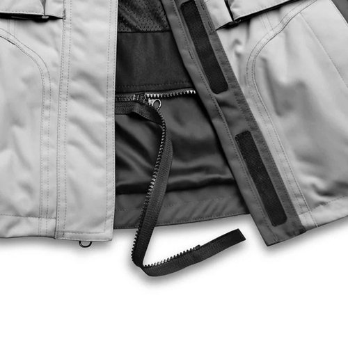 Two-way zipper front with interior and exterior storm flap. Adjustable cuffs.
