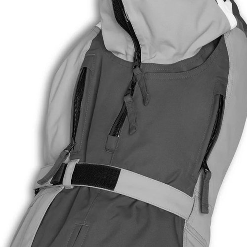for less bulk. Adjustable waist belt. Hip release zippers. Jacket-to-pant zipper
