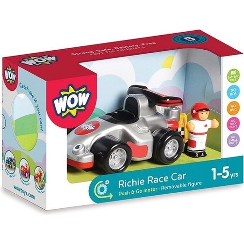 Join the race to the finish line with Richie Race Car, the super-fast race car from WOW Toys. Push Richie Race Car along to see his motorised engine get him to the finish line in no time at all. His cool spoiler and removable driver figure make Richie one of the favourites to win the race. He also has a magnetic hook compatible with all WOW Toys trailers.